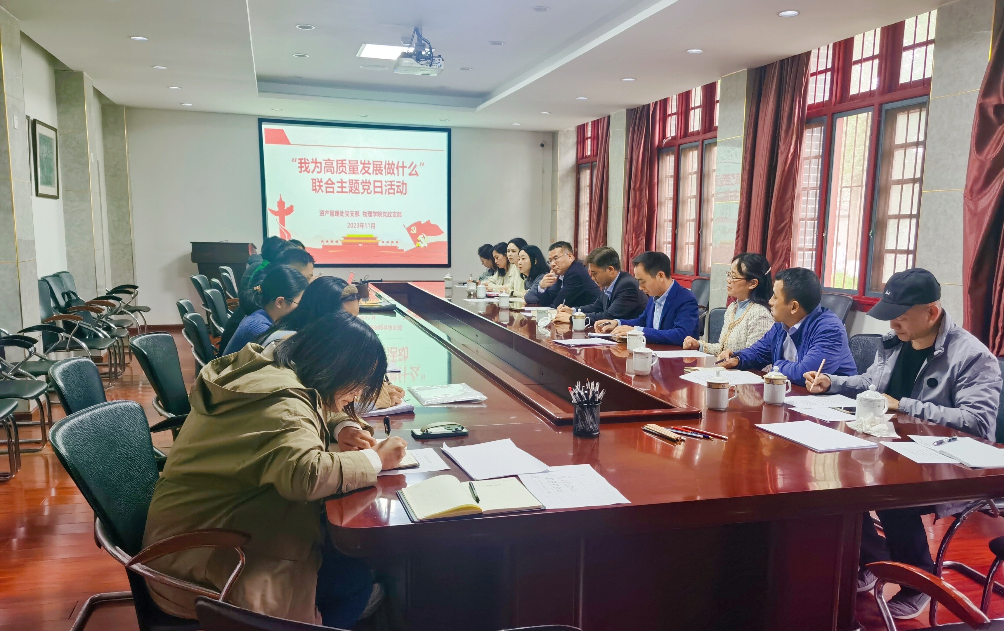 2023年11月10日下午,122cc太阳集成游戏联合物理学院党政支部开展“我为高质量发展做什么”主题党日活动,两个支部全体党员参加了此次活动。会议由物理学院党委书记严成辉主持。