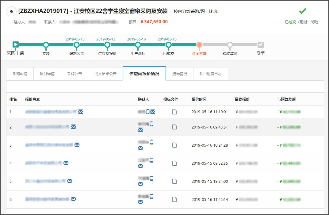2019年5月13日,太阳成集团tyc122cc招投标与采购中心采用“网上比选”采购方式,向社会公开发布了“ [ZBZXHA2019017] -江安校区22舍学生寝室窗帘采购及安装”项目。本次采购需求公告吸引了近千次供应商浏览关注,多名潜在供应商通过网上报名,在线提交响应方案参与项目竞争,用户单位选择了满足要求且性价比最优的供应商响应方案,顺利完成采购目标。